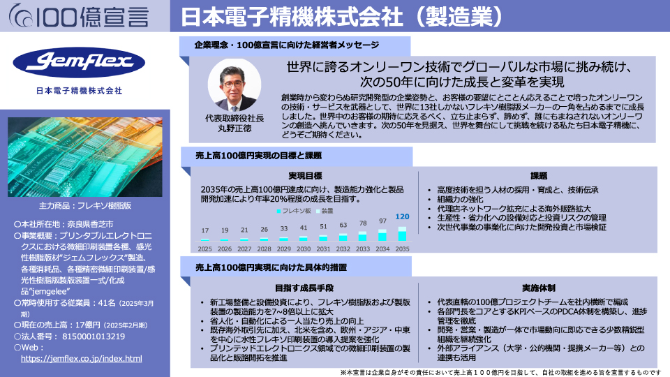2025年6月、日本電子精機株式会社は経済産業省中小企業庁が推進する「100億宣言企業」として正式に認定されました。